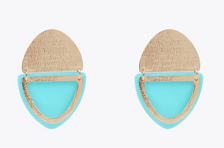 Pendientes colgantes dorados con doble pieza en contraste de metal y acrílico turquesa . Cierre mediante pin.